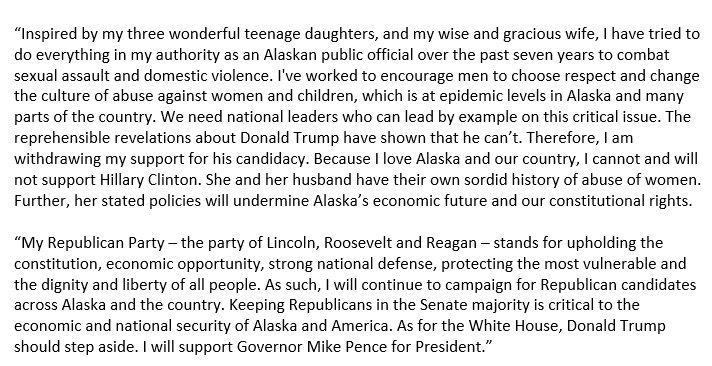 “In addition to my well known differences with Donald Trump on public policy issues, I have raised questions about his character after his comments on Prisoners of War, the Khan Gold Star family, Judge Curiel and earlier inappropriate comments about women. Just this week, he made outrageous statements about the innocent men in the Central Park Five case.“As I said yesterday, there are no excuses for Donald Trump’s offensive and demeaning comments in the just released video; no woman should ever be victimized by this kind of inappropriate behavior. He alone bears the burden of his conduct and alone should suffer the consequences.“I have wanted to support the candidate our party nominated. He was not my choice, but as a past nominee, I thought it important I respect the fact that Donald Trump won a majority of the delegates by the rules our party set. I thought I owed his supporters that deference.“But Donald Trump’s behavior this week, concluding with the disclosure of his demeaning comments about women and his boasts about sexual assaults, make it impossible to continue to offer even conditional support for his candidacy. Cindy, with her strong background in human rights and respect for women fully agrees with me in this.“Cindy and I will not vote for Donald Trump. I have never voted for a Democratic presidential candidate before but this election we will vote for Hillary Clinton. ”